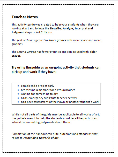 Need help with activities about responding to works of art? This 24 page booklet makes looking at, thinking about and making judgments about art and art criticism easy. Using the 4 steps of art criticism: description, analysis, interpretation and judgment, students will easily work their way through a series of prompts to learn more about the artwork. Great as an on-going activity to supplement the artroom if projects are completed or are drying, group members are missing or as an emergency substitute teacher activity. It can even be used to assess the student’s own work or the work of their classmates! The download includes two versions of the booklet: one for grades 3 – 6 and one for middle to upper grades. The lower level has large print, fill in bubbles, graphics and simple to answer questions. The upper grade is more text based. I hope you find it comprehensive and a welcome addition to your classroom!